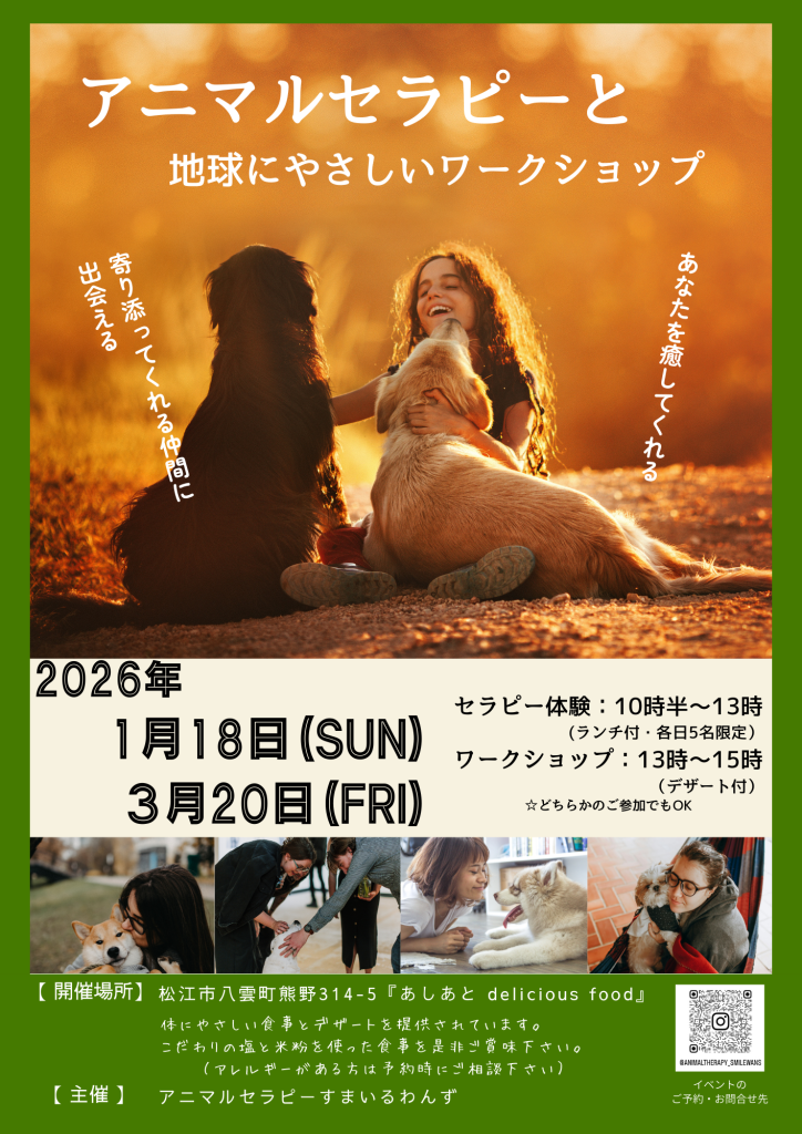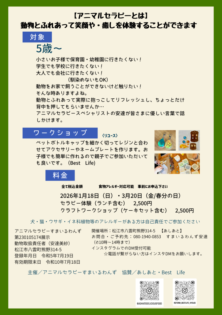 アニマルセラピーと地球にやさしいワークショップ 3月20日㈮子供でも大人でも心が疲れた時や家で飼えないけど犬が大好きな方、アニマルセラピーを通して癒されてみませんか。午前はアニマルセラピーを午後はワークショップを開催します予約はInstagramのDM又はお電話でお願いいたします。
