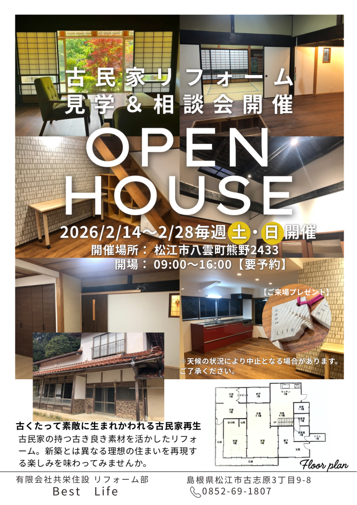 古民家リフォームの見学&相談会古民家をリフォームし生まれ変わった姿を見学してください。古い物も新しい物と合わされば新鮮な家になります。2/14(土)2/15(日)2/21(土)2/22(日)2/28(土)開催します。ご予約お願い致します。
